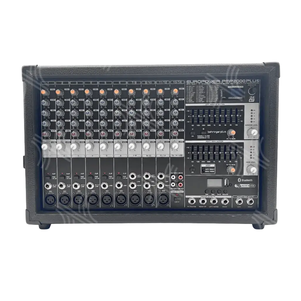 Behringer PMP2000 - ميكسر صوت محمول بقوة 800 وات مع معالج مؤثرات متعدد تحكم احترافي بصوتك في أي مكان استمتع بصوت قوي وواضح بفضل قدرة 800 وات.الميكسر يدعم البلوتوث وUSB لتشغيل سهل ومريح بدون كابلات.